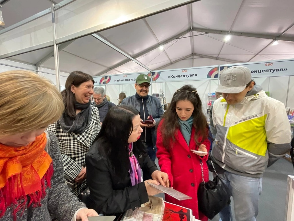 После окончания встречи общение с спикерами встречи и знакомство с книгами было продолжено на стенде национальных литератур народов России.